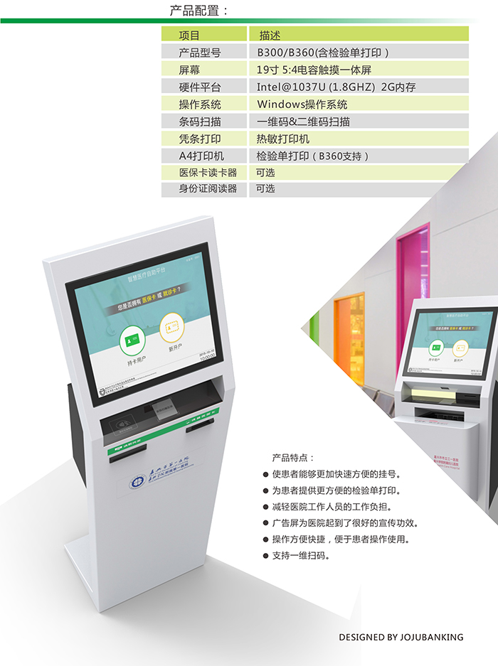 此產品可用于門診、檢驗科,結合醫院醫療信息系統(HIS),為患者提供門診掛號、檢驗取號功能和檢驗單打印功能。結合硬件模塊應用,患者可在觸屏上操作進行簡要排隊取號,掃描檢驗單上的一維碼,就可以快速 得知自己的檢驗結果是否完成,在完成的情況下機器可以自動打印檢驗單。患者可以更加方便快捷的取到化驗單。營造一個更加方便高效的就診環境,減輕掛號部門的工作壓力。使醫院的門診醫療服務和質量得到了大的提高,提升醫院的核心競爭力和知名效益。